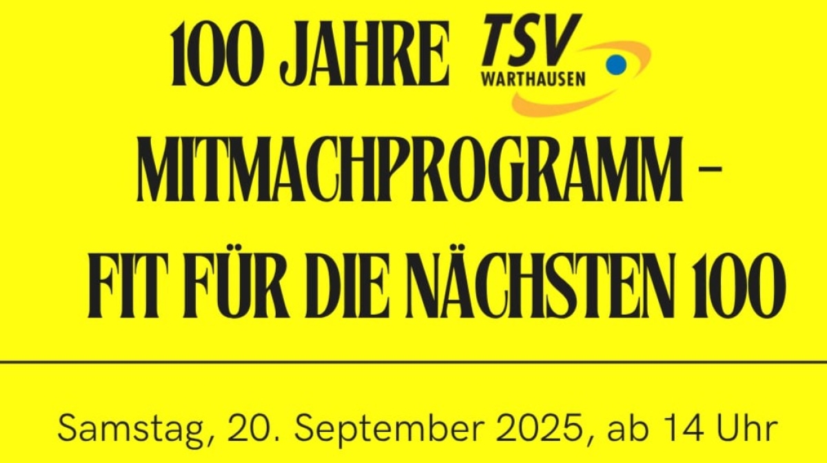 Unter dem Motto "Fit für die nächsten 100" möchten wir alle herzlich zu unserem Mitmachprogramm einladen - egal ob Sportskanone, Hobbysportler oder Neueinsteiger. Hier ist für alle etwas dabei. Die Mitmachaktion findet auf dem Sportgelände in Warthausen im Rahmen des Festwochenendes statt. Es ist keine Anmeldung erforderlich.