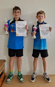 Am ersten Tag der Bezirksmeisterschaften in Schwendi zeigten sich unsere Jugend in der Klasse U13 von der besten Seite. Julian Nielsen und Jonas Tomeit mussten je eine Niederlage in der Gruppenphase hinnehmen, qualifizierten sich trotzdem beide für die KO Phase. Im Achtel- und Viertelfinale konnten sich beide durchsetzen und trafen im Halbfinale aufeinander. Hauchdünn konnte sich hier Tomeit in 5 Sätzen durchsetzen und ins Finale einziehen. Dort musste er sich gegen starken Wu aus Steinhausen geschlagen geben und wurde Vizemeister. Im Spiel um Platz 3 siegte Nielsen, damit konnten sich beide Spieler einen Pokal und einen Platz auf dem Siegertreppchen sichern.