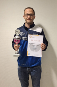 Tobias konnte sich mit guten Leistungen in der Gruppe durchsetzen. Nach zwei knappen Siegen im Viertel- und Halbfinale bezwang er den Ertinger Spitzenspieler Gerd Jäggle deutlich mit 3:0. Damit krönte er sich zum Herren Bezirksmeister in der stärksten Spielklasse und qualifizierte sich damit für die Baden-Württembergischen Meisterschaften.